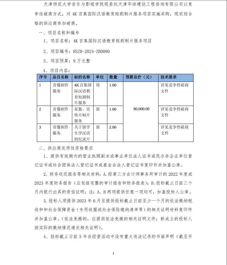 4K 百集国际汉语教育短剧制片服务项目竞争性磋商公告