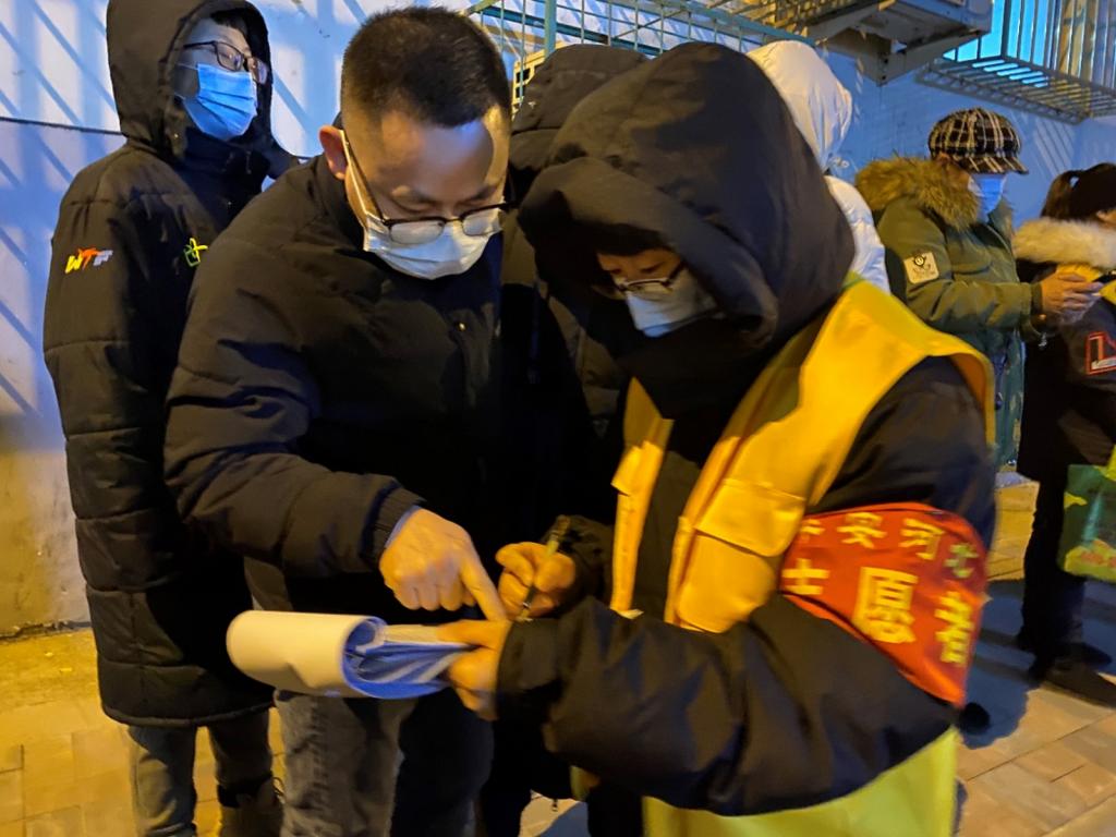 1月10日晚上10:30,刚刚收到了键盘表演系教师黄佳发来的一条语音。刚完成河东区大王庄街丰盈里社区的志愿服务工作,她说自己刚到家,感觉手脚都快冻掉了,没有知觉。凌晨两点马上要再次集结,继续到岗服务。黄佳人瘦瘦高高的,平时说话轻声细语,她没有一句抱怨、畏缩的话,却总是不好意思地和我连声说晚上打扰,让我早休息。后来几天,我又陆续收到了很多她在现场的照片,有疏导秩序、传递试管的,也有采样数据实时上报、整理红码橙码人群的,还有开展隔离酒店和隔离点周边重点人员排查等工作任务的照片,不同的工作场景,一样的认真忙碌,给我留下了深深的印象。