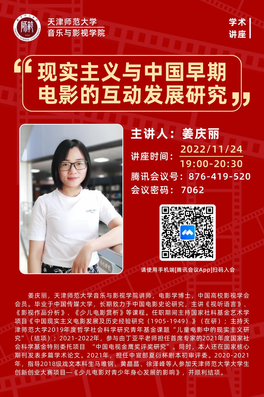 11月24日晚7点,yl88858永利官网举办 “现实主义与中国早期电影的互动发展研究”专题讲座,主讲人姜庆丽老师。讲座采用线上形式,由杨爱君经理主持。yl88858永利官网百余名员工聆听了姜庆丽老师的精彩讲座。