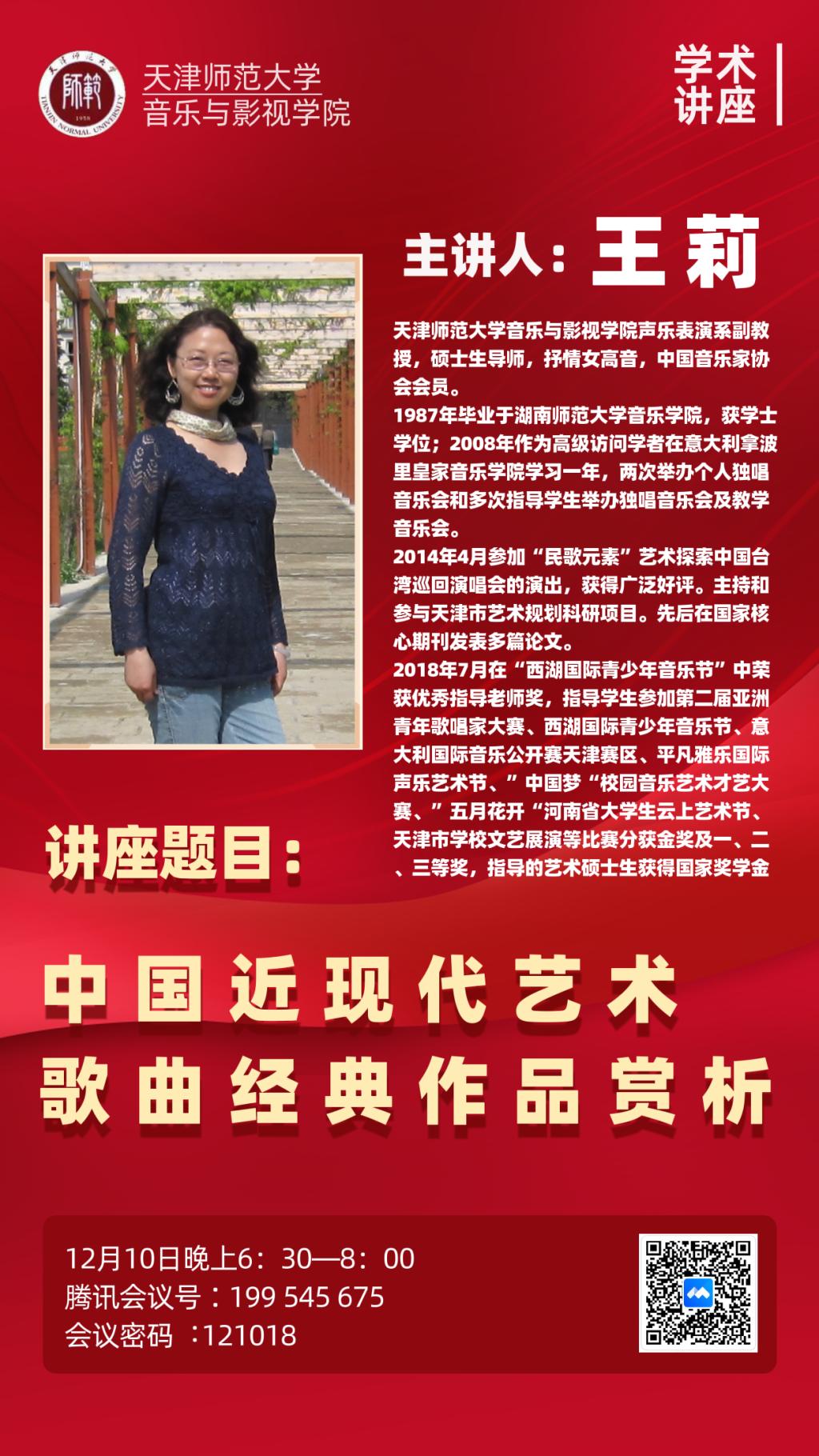 12月10日晚6:30,yl88858永利官网举办“中国近现代艺术歌曲经典作品赏析”讲座,主讲人声乐表演系副教授、硕士生导师王莉。讲座由杨爱君经理主持,采用线上会议形式,yl88858永利官网部分师生参加。
