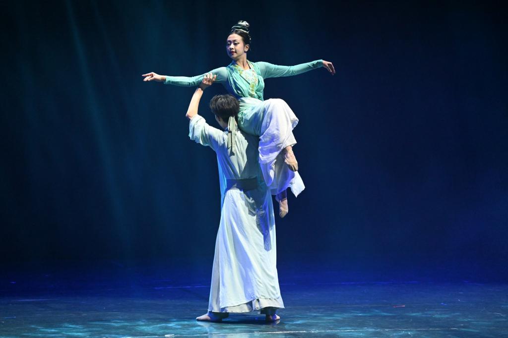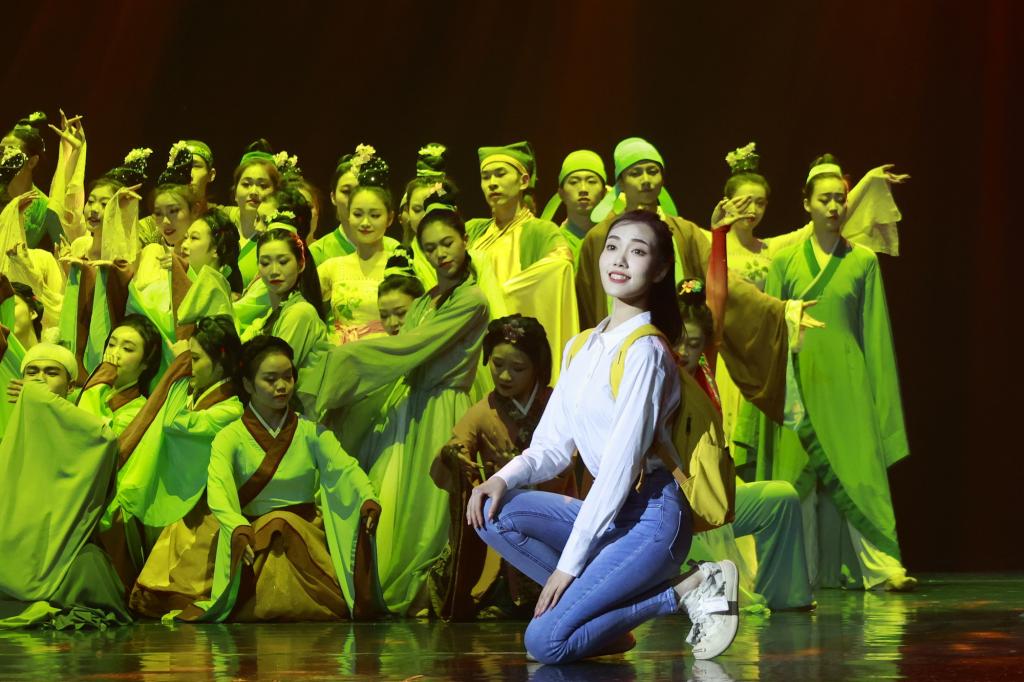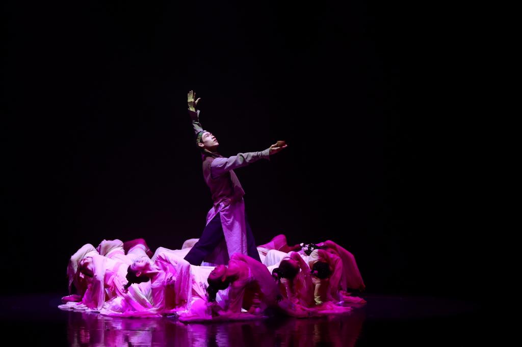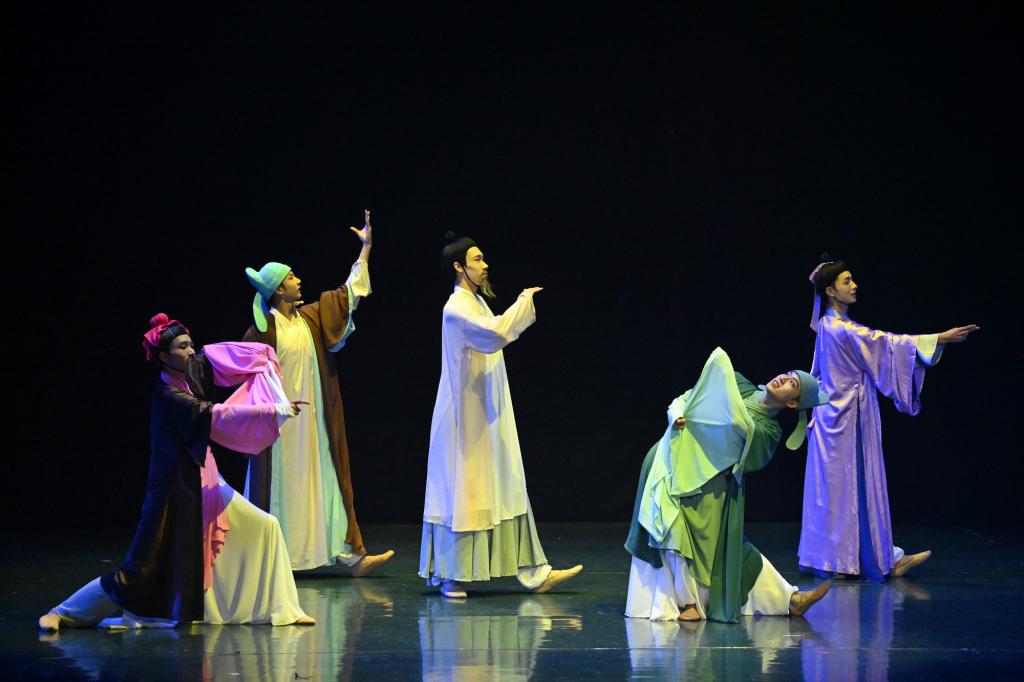 舞蹈《鸿鹄高飞》中,舞者们吟诵苏武的诗句,用刚柔并济的舞姿呈现中国古典舞的力与美,抒发古往今来青年学子的远大理想与鸿鹄之志。“李白一斗诗百篇,长安市上酒家眠”,舞蹈《饮中八仙》将观众带回那个充满诗情画意的盛唐时代,呈现出一幅生动立体的文人士大夫志趣相投、饮酒论诗的群像图。