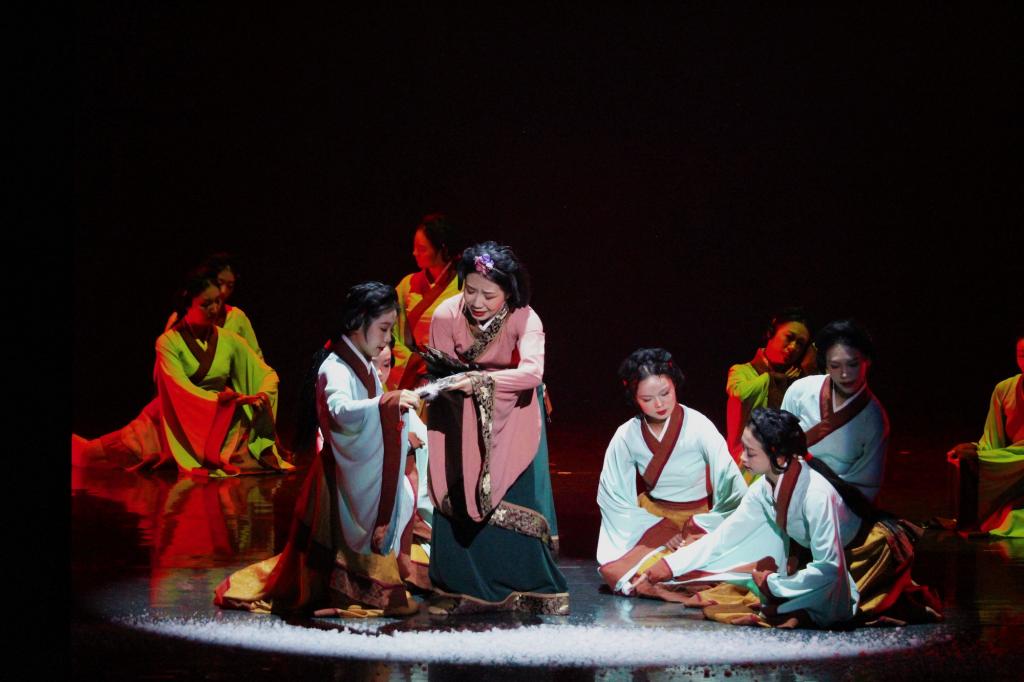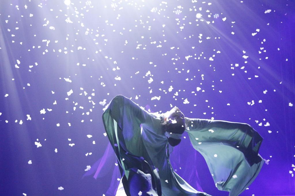 整场演出以现代员工穿越古今的视角呈现,表现了各个时代对中华优秀传统文化的不同理解与诠释。舞蹈《昔我往昔》通过呈现平凡女子的一生,感叹时光不可逆流,劝诫人们珍惜当下,拥抱美好的生活。舞台一轮明月升起,独舞《天涯共此时》在舞者的演绎下,抒发游子对家乡和亲人的深深眷恋。苏轼的千古名句在舞台上化为双人舞《但愿人长久》,轻盈曼妙的舞姿生动演绎了“人有悲欢离合,月有阴晴圆缺”的无奈与叹息,也谱写出“但愿人长久,千里共婵娟”的美好愿景与期盼。