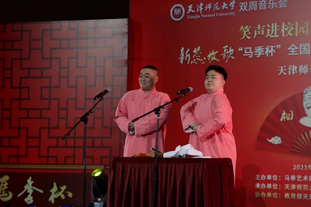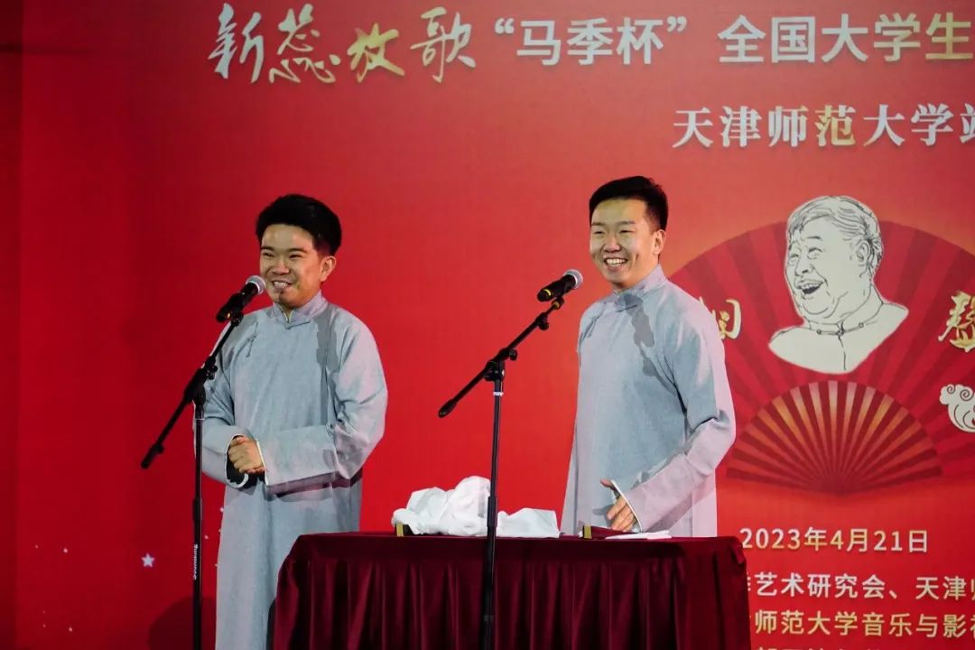 第一届、第二届“马季杯”获奖选手,天津艺术职业公司毕业生赵烜伟、兰天铄刚一上场就在一捧一逗间将现场气氛调动了起来。他们带来的新作《解放天津那一幕》,通过相声这一观众们喜闻乐见的艺术形式再现了天津解放的历史场景,在笑闹间向同学们普及了革命知识,做到了红色文化与传统艺术的创新融合。