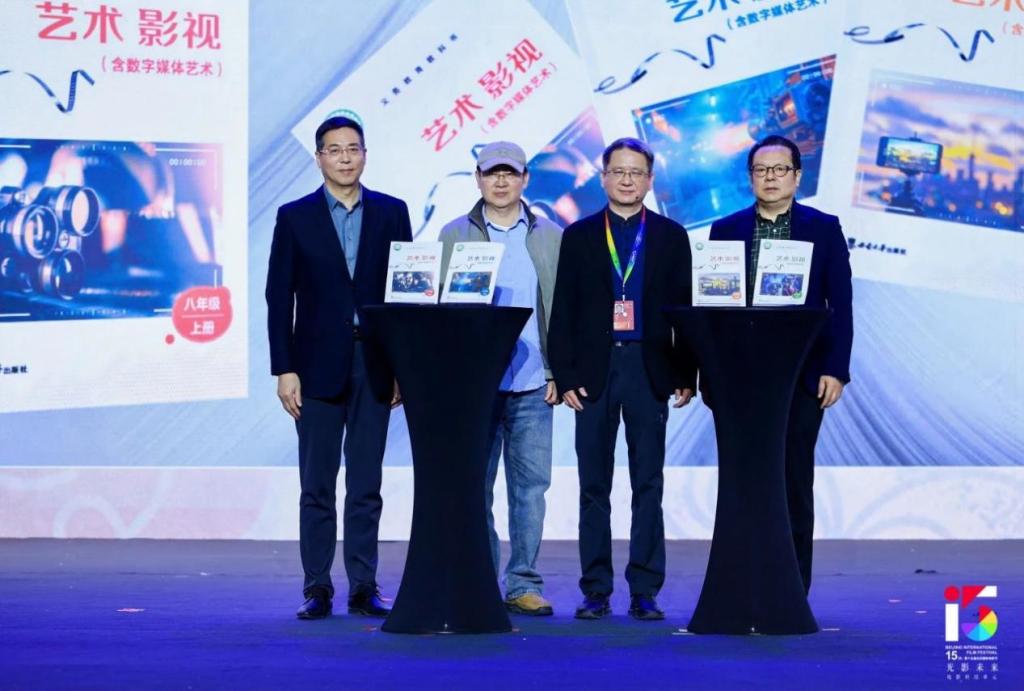 接着,由北大影视戏剧研究中心主任旭光主编,为贯彻落实教育部和中宣部联合印发的关于加强中小学影视教育的指导意见精神,根据义务教育艺术课程标准2022年版的理念和要求编写的义务教育教科书《影视(含数字媒体艺术)》(八九年级)正式发布。北大影视戏剧研究中心主任、教育部“长江学者”特聘教授陈旭光发表致辞,表示该套教科书严格按照课标要求把握艺术课程的育人价值,突出核心素养目标导向;以中国为主兼顾世界,传承中华优秀文化传统,弘扬革命文化,讲好中国故事;既简洁阐释影视艺术多维度的综合性,又努力呈现影视的新技术和新发展。